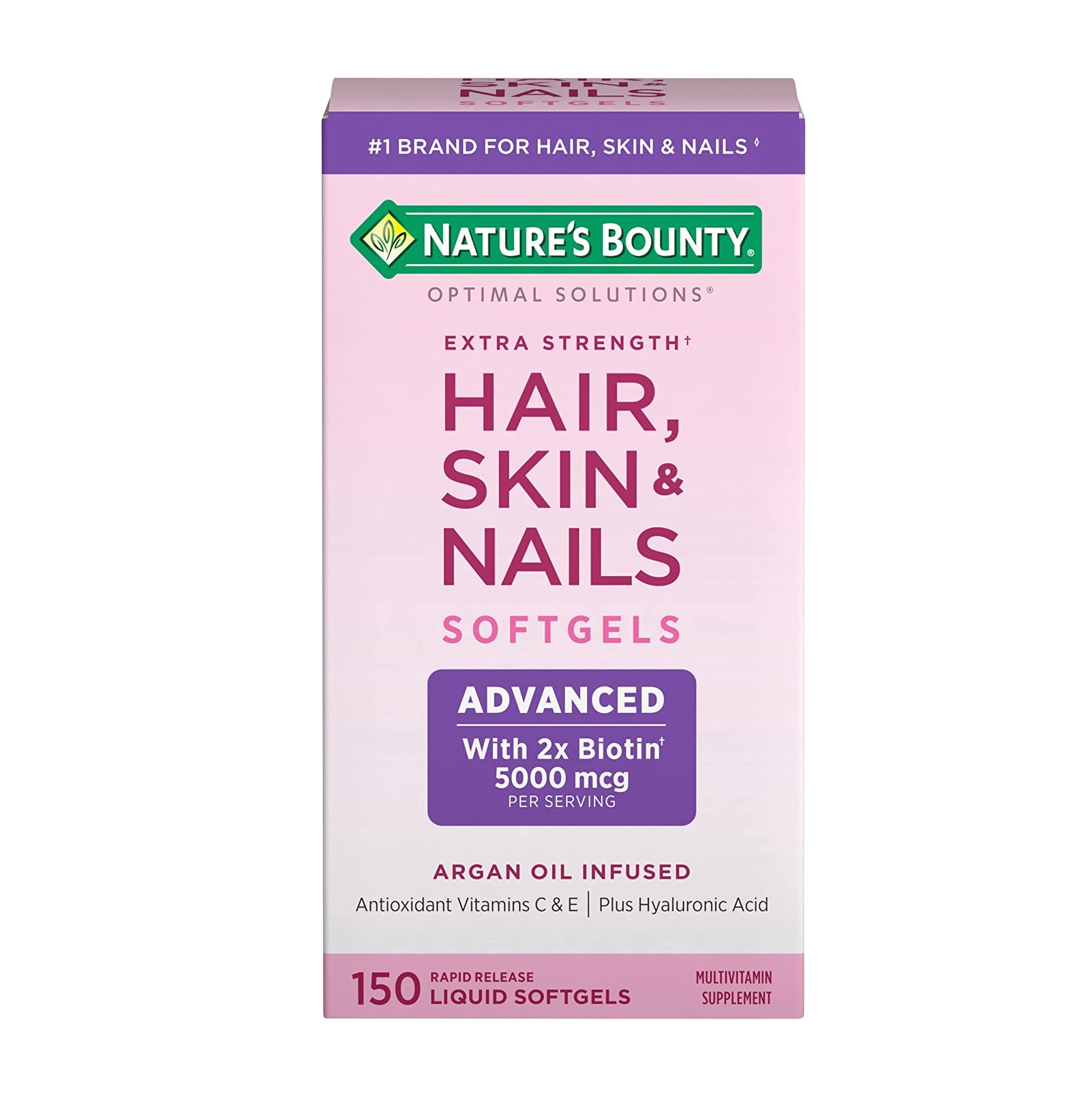 مکمل پوست مو و ناخن نیچرز بونتی با یک فرمولاسیون سافت ژل حاوی 5000 میگرو گرم بیوتین است. این دوز از بیوتین به خوبی باعث درمان ریزش مو و افزایش استحکام ناخنها میشود. هر قوطی این مکمل حاوی 150 عدد قرص است.